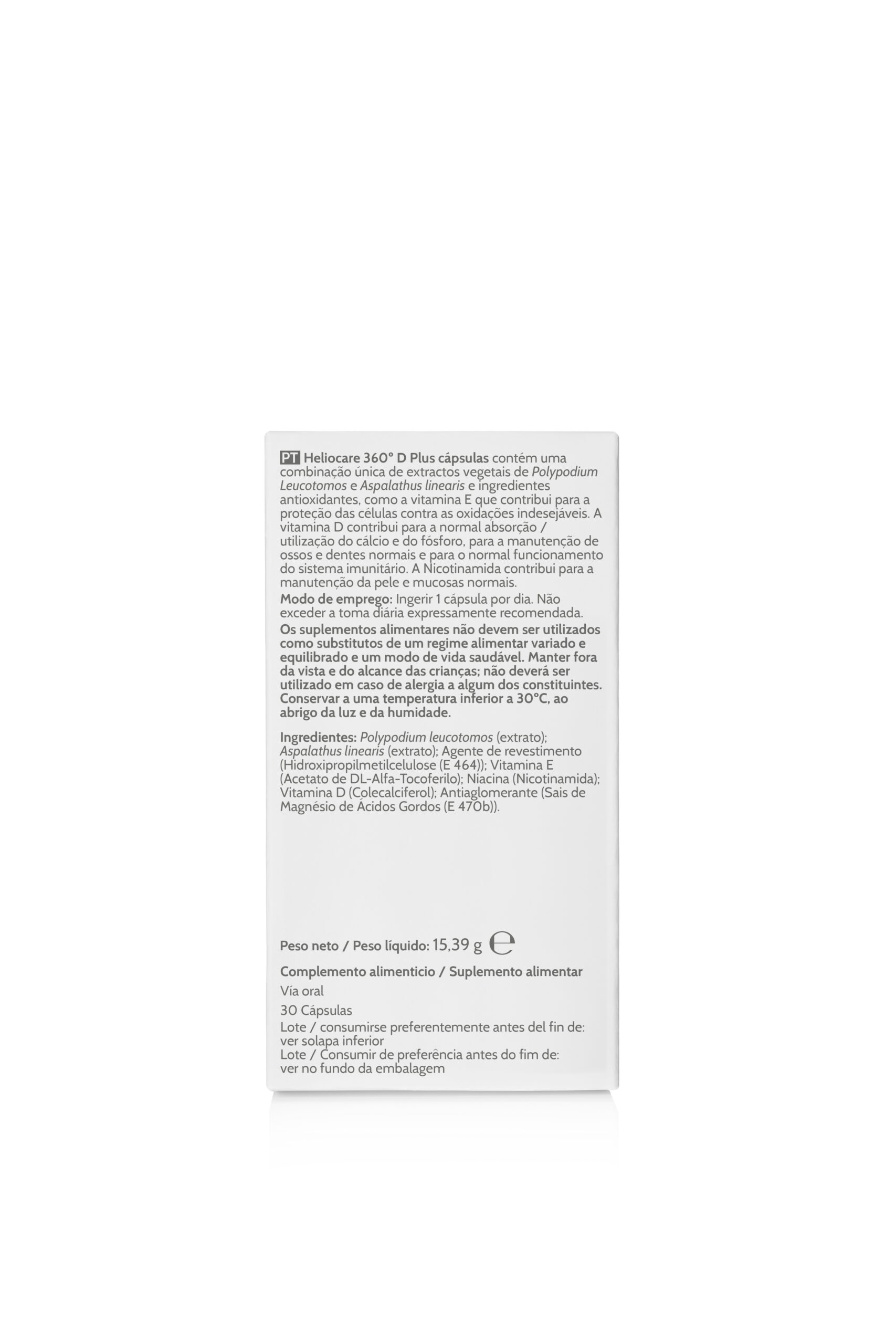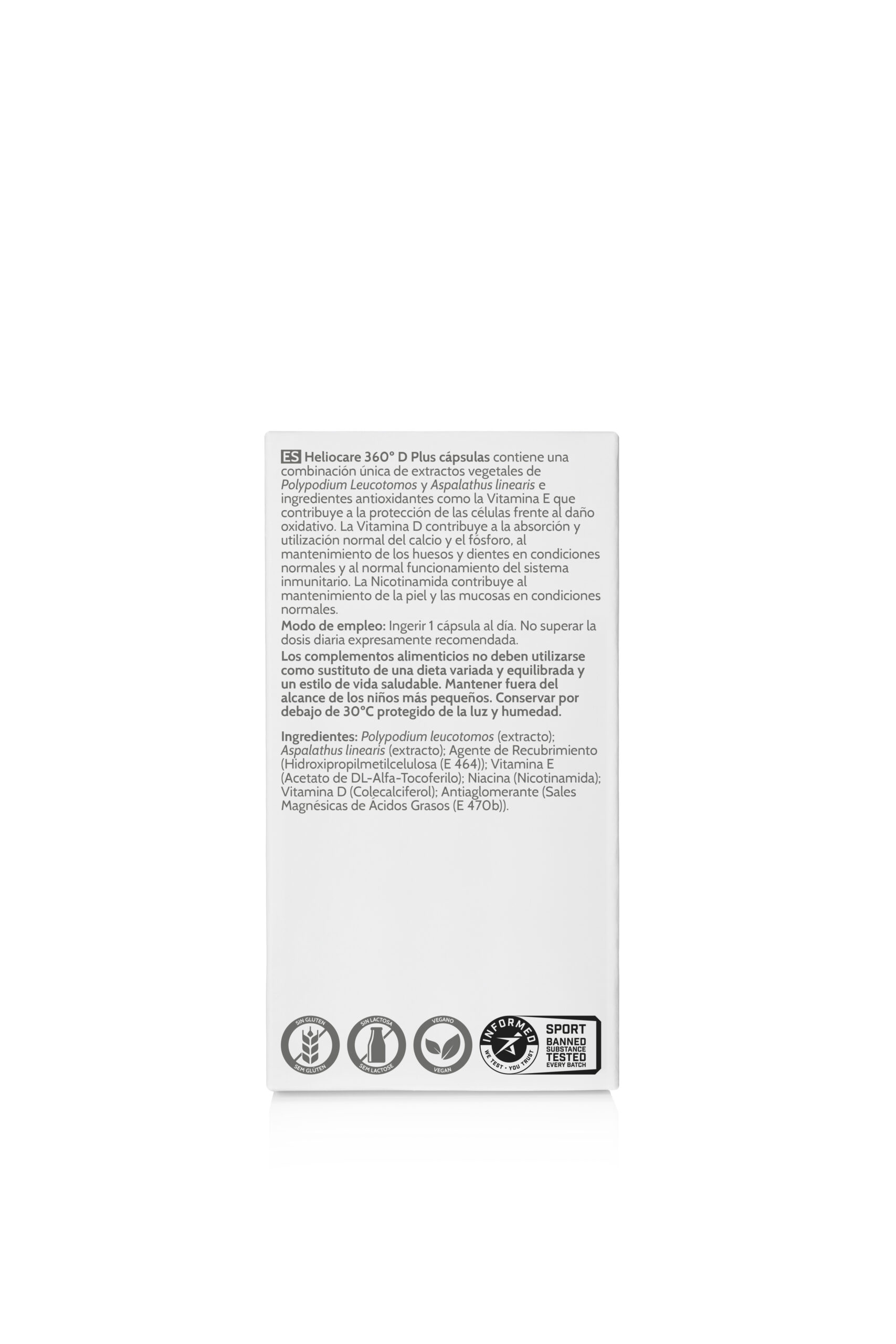 Polypodium Leucotomos Extrakt; Überzugsmittel: Hydroxypropylmethylcellulose (E 464); Füllstoff: Isomalt (E 953); Vitamin E (DL-Alpha-Tocopherylacetat); Niacin (Nicotinamid); Vitamin D (Cholecalciferol); Trennmittel: Magnesiumsalze der Speisefettsäuren (E 470b).