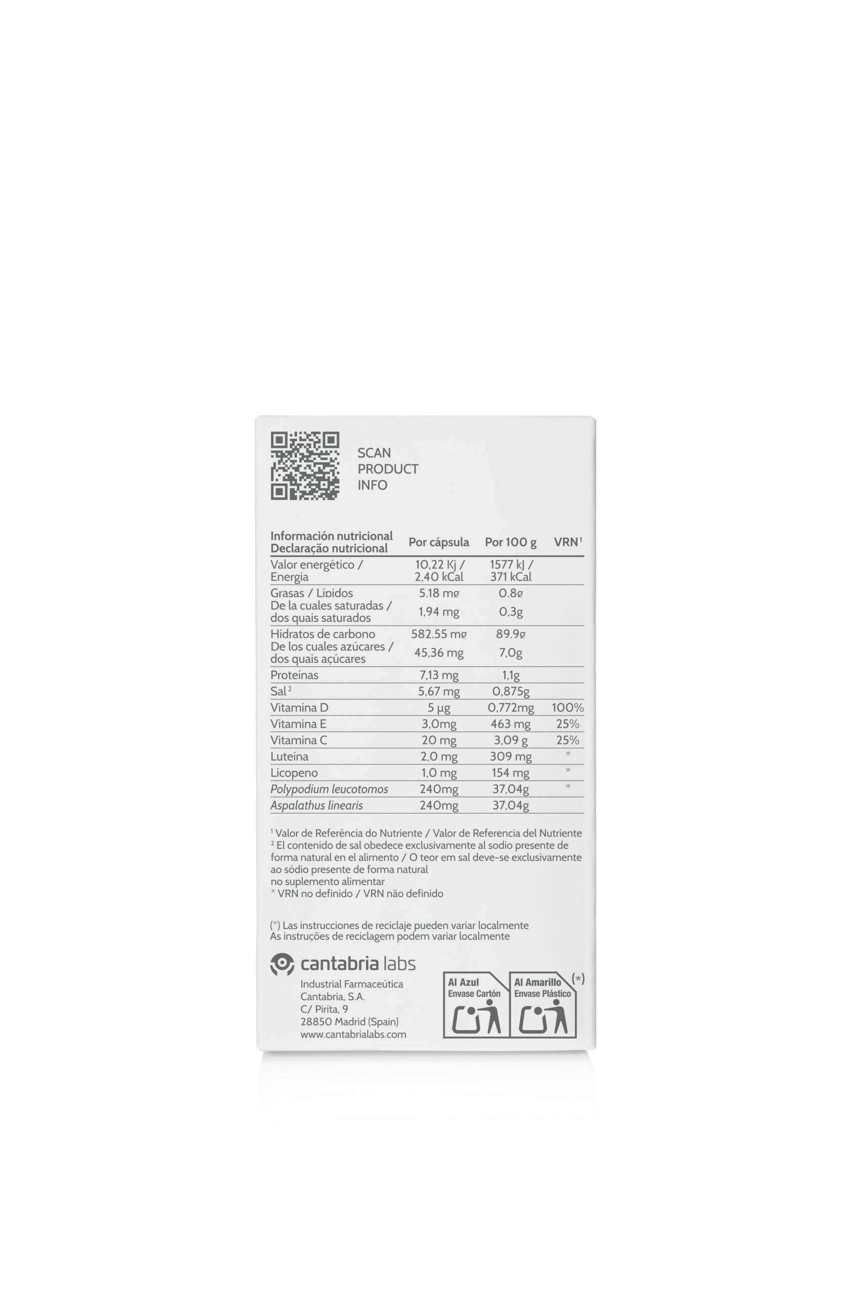 Polypodium Leucotomos Extrakt, Lutein, Vitamin C (L-Ascorbinsäure), Lycopin, Vitamin D (Cholecalciferol), Vitamin E (DLAlpha- Tocopherylacetat), Kapselhülle: Hydroxypropylmethylcellulose (E-464); Farbstoffe: gelbes Einsenoxid, schwarzes Eisenoxid